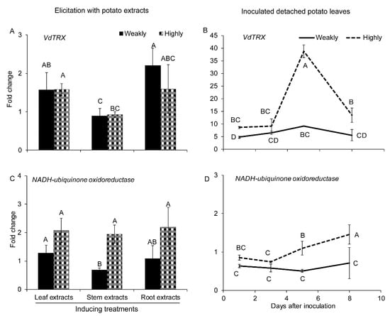 Expression of genes involved in ROS regulation under different treatments. Expression of (A) Thioredoxin (Trx) and (C) NADH-ubiquinone oxidoreductase in the highly (Vd1396-9) and the weakly (Vs06-07) aggressive V. dahliae isolates in response to elicitation with different potato extracts: leaf, stem, root extracts. Expression of (B) Trx and (D) NADH-ubiquinone oxidoreductase in the highly (Vd1396-9) and the weakly (Vs06-07) aggressive V. dahliae isolates in response to infection of detached potato leaves at 1, 3, 5, and 8 DAI. WC: Water control treatment; Weakly: weakly aggressive V. dahliae isolate Vs06-07; Highly: highly aggressive V. dahliae isolate Vd1396-9. Error bars refer to standard error. The macro PDMIX800.sas [53], α = 0.05 was applied to mean values separated by least squared means, and into grouped letters results. Values (n = 3) with the same letters are not significantly different (p < 0.05).