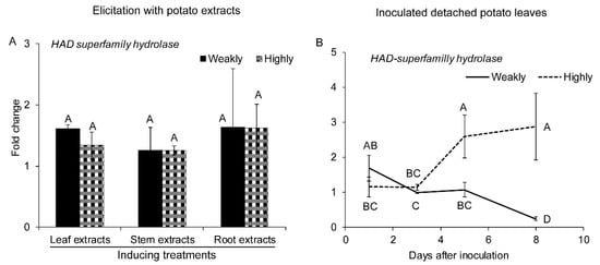 Expression of genes related to detoxification under different treatments. (A) Expression of HAD superfamily hydrolase in the highly (Vd1396-9) and the weakly (Vs06-07) aggressive V. dahliae isolates in response to elicitation with different potato extracts: leaf, stem, root extracts. (B) Expression of HAD superfamily hydrolase in the highly (Vd1396-9) and the weakly (Vs06-07) aggressive V. dahliae isolates in response to infection of detached potato leaves at 1, 3, 5, and 8 DAI. WC: Water control treatment; Weakly: weakly aggressive V. dahliae isolate Vs06-07; Highly: highly aggressive V. dahliae isolate Vd1396-9. Error bars refer to standard error. The macro PDMIX800.sas [53], α = 0.05 was applied to mean values separated by least squared means, and into grouped letters results. Values (n = 3) with the same letters are not significantly different (p < 0.05).