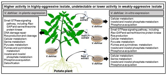 In conclusion, the expression level of most of the genes we tested increased in both weakly and highly aggressive isolates in response to treatment with the various potato extracts. The metabolism of pyruvate, purines and pyrimidines, inositol and inositol phosphate, and phosphorus acquisition may be activated more in the highly aggressive isolate than in the weakly aggressive one in response to the various potato extracts (Figure 7). The genes involved in ROS production (NADH-ubiquinone oxidoreductase) and small GTPase signaling pathway (including Ras-GAP and serine/threonine protein kinase) were also elevated in the highly aggressive isolate more than the weakly aggressive one when exposed to potato stem extracts, suggesting a higher activity in these pathways (Figure 7). During infection of potato detached leaves, there were more up-regulated genes in the highly aggressive isolate than the weak aggressive one. These genes include key elements in the small GTPase signaling pathway, which include Ras-GAP and serine/threonine protein kinase, DNA damage repair, ROS production and cleavage, cellular metabolism, and detoxification. These results suggest an important role for all of these pathways during infection. This study provides a detailed follow up on the temporal expression of genes identified in our previous studies [22,23]. Together with more recent functional analyses of selected genes and interaction with host defense components [21,24,131], this study provides another background to reflect on which metabolic reactions contribute to disease, and which ones rather contribute to less disease or lack of it. The work ahead should put emphasis on the spatiotemporal expression of these genes during these interactions in order to fine-tune the expression map of genes that are important for the pathogen to invade its hosts. Further functional analyses of these genes should validate their involvement in an integrated picture of the arsenal that V. dahliae uses against its most economic hosts. This will no doubt help us to the right direction of future management tools against Verticillium wilt disease.