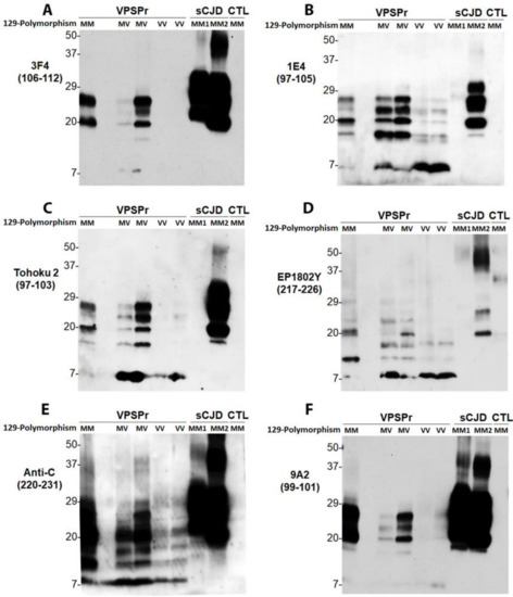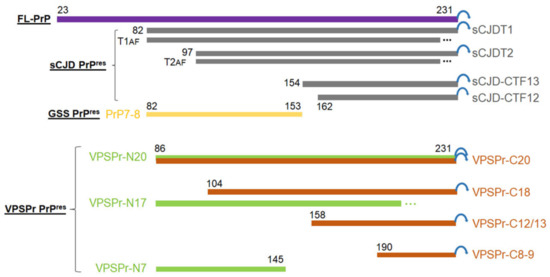 - Zou, W.Q.; Capellari, S.; Parchi, P.; Sy, M.S.; Gambetti, P.; Chen, S.G. Identification of novel proteinase K-resistant C-terminal fragments of PrP in Creutzfeldt-Jakob disease. J. Biol. Chem. 2003, 278, 40429–40436. [Google Scholar] [CrossRef]