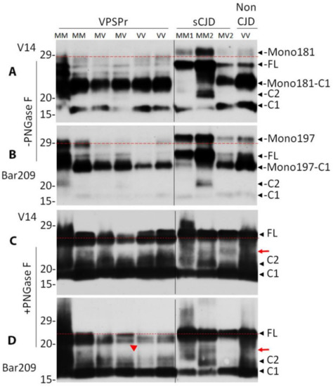 - Notari, S.; Strammiello, R.; Capellari, S.; Giese, A.; Cescatti, M.; Grassi, J.; Ghetti, B.; Langeveld, J.P.; Zou, W.Q.; Gambetti, P.; et al. Characterization of truncated forms of abnormal prion protein in Creutzfeldt-Jakob disease. J. Biol. Chem. 2008, 283, 30557–30565. [Google Scholar] [CrossRef]