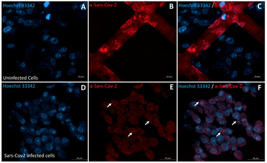 Immunohistochemistry of SARS-CoV-2 in Vero E6 cells. Confocal laser scanning microscope images of 100 nm thick ultra-thin sections (Z-maximal projections) of uninfected (A–C) and SARS-CoV-2-infected (D–F) Vero E6 cells: Hoechst 33342 (DNA staining), and anti-SARS-CoV-2 antibody (red). Immunofluorescence staining of SARS-CoV-2 did not show any fluorescence inside the uninfected cells (B,C) while showing scattered fluorescent spots (red) inside the cells (white arrows) (E,F). Scale bars: (A–C) 10 µm; (D–F) 20 µm.