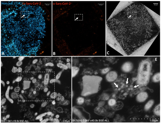 Correlative light fluorescence and electron microscopy in an ultra-thin section of sewage sample. Confocal laser scanning microscopy images of 100-nm-thick ultra-thin section (Z maximal projection) of a sewage sample (A,B), DNA stained with Hoechst 33342 (blue) and the SARS-CoV-2 particles labelled with anti-SARS-CoV-2 spike protein (orange-red). Scanning electron microscopy images (C–E) of the ultra-thin section shown in (A,B). The boxed region of interest in ((A–C), scale bars 10 µm) is shown at a higher magnification in ((D), scale bar 3 µm). Boxed region in (D) is zoomed in ((E), scale bar 1 µm) with hypo-electron dense circular structures surrounded by a hyper-dense crown-like shapes with 75–100-nm diameters (arrows) are present in the boxed region positive for anti-SARS-CoV-2 fluorescence.