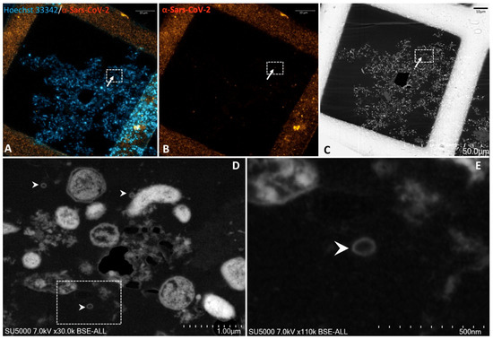 Correlative light fluorescence and electron microscopy in an ultrathin section of sewage sample. Confocal laser scanning microscopy images of a 100-nm-thick ultra-thin section (Z maximal projection) of the sewage sample (A,B), with DNA staining (Hoechst 33342, blue) and SARS-CoV-2 particles labelled with anti-SARS-CoV-2 spike proteins (orange-red). Scanning electron microscopy images (C–E) of the ultra-thin section shown in (A,B). The boxed region of interest in ((A–C), scale bars 10 µm) is shown at a higher magnification in ((D), scale bar 1 µm): SARS-CoV-2 particles appearing empty with only a thin surrounding envelope can be depicted (arrowheads). Boxed region in (D) is zoomed in ((E), scale bar 500 nm) with empty SARS-CoV-2 like particle (arrowhead).