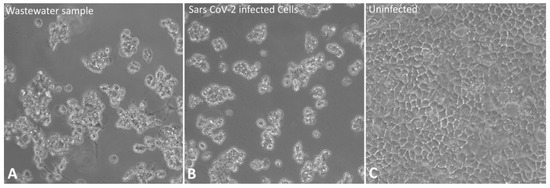 Viral replication assay on Vero E6 cells. Vero E6 cells were inoculated with either a wastewater sample (A) or with SARS-CoV-2 ((B); positive control) or the culture medium only ((C); negative control). A cytopathic effect was observed for both the wastewater sample and SARS-CoV-2 infected cells from two days post-infection.