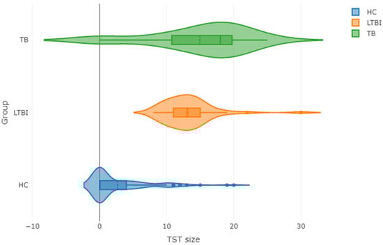The violin plots for the TST size in the three studied groups. The shape of the plot represents the fitted density of the distribution in the respective group. Abbreviations: HC—M.tb-uninfected healthy controls; LTBI—latently M.tb-infected individuals; TB—active tuberculosis patients.