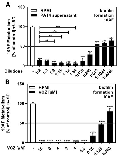 Dose–response curves showing IC50s for the antifungal effects of P. aeruginosa wild-type strain PA14 supernatant and VCZ dilutions against 10AF forming biofilm. PA14 wild-type bacteria (5 × 107/mL in RPMI 1640 medium) supernatant in twofold serial dilutions (final concentrations: 1:2 to 1:2048) (A) or VCZ in twofold serial dilutions (final concentrations: 16 to 0.063 µM) (B) were added to 10AF conidia (105 conidia/mL in RPMI 1640 medium). Assay plates were incubated at 37 °C overnight. Fungal metabolism was measured by XTT assay. Metabolism in the presence of RPMI alone was regarded as 100% and compared to each supernatant dilution. Statistical analysis: one-way ANOVA: two asterisks = p ≤ 0.01, three asterisks = p ≤ 0.001, respectively. Comparison: RPMI (white bar) vs. all other bars (black bars), or as indicated by the ends of the brackets.