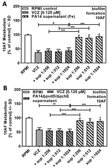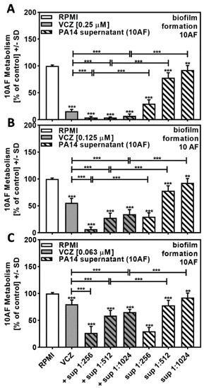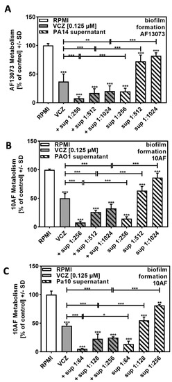 We then studied supernatants of the widely used P. aeruginosa reference strain PAO1 and investigated combination of its supernatants with VCZ against 10AF forming biofilm metabolism. Our results showed similar effects as observed for the PA14 supernatant–VCZ interaction (compare Figure 3B to Figure 2B).