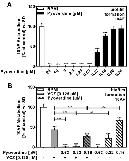 Pyoverdine significantly increased antifungal effects of VCZ against A. fumigatus forming biofilm metabolism. (A) Dilutions of pure pyoverdine in RPMI (20 to 0.04 µM) were tested for activity against forming 10AF (105 conidia/mL in RPMI 1640 medium) biofilm metabolism. RPMI alone (white bar) was regarded as 100% and was compared to pyoverdine dilutions (black bars). Statistical analysis: one-way ANOVA: three asterisks: p ≤ 0.001. (B) Pure pyoverdine (0.063, 0.032, and 0.016 µM) was combined with VCZ (0.125 µM) and tested for combined antifungal activity against 10AF (105 conidia/mL in RPMI 1640 medium) forming biofilm. 10AF fungal metabolism was measured by XTT assay. Statistical analysis: metabolism in the presence of RPMI alone (white bar) was regarded as 100% and compared by unpaired t-test to VCZ alone (gray bar), pyoverdine concentrations alone (striped bars), and their combinations (gray striped bars). One-way ANOVA: VCZ vs. all VCZ combinations. Unpaired t-test for each pyoverdine concentration vs. its combination with VCZ: two or three asterisks: p ≤ 0.01, p ≤ 0.001, respectively.