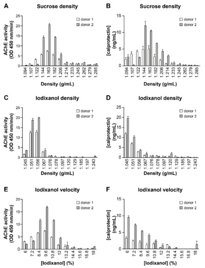 Plasma contain abundant potential contaminants like microparticles (from platelets), immune complex aggregates, a significant amount of immunoglobulins (up to 10 mg/mL), albumin, and inflammatory protein such as calprotectin and all these components can interfere with EVs precipitation. Sucrose density (Figure 4A,B), iodixanol density (Figure 4C,D), and iodixanol velocity (Figure 4E,F) gradients were used to separate calprotectin from plasma AChE-positive EVs. The results show that velocity gradient (Figure 4E,F) fractions richer in AChE activity (8.4–10.8% iodixanol) are not enriched in calprotectin (highest in 6–8.4% iodixanol). This observation suggests that calprotectin is not bound to the AChE-EVs sub-types in contrast with results obtained using two density gradients (Figure 4A–D).
