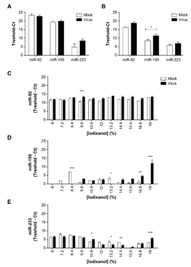 We have reported previously that plasma EVs in ART-naïve HIV-1 patients were rich in miR-92, miR-155, and miR-223 and that the abundance of miR-155 and miR-223 was strongly correlated with EVs size and AChE activity [5]. Deep sequencing revealed that the most abundant species of RNA in EVs is microRNA [46]. To determine if HIV-1 could cause the noted effects on microRNA, we compared expressions by NL4-3 infected and mock-infected Raji-CD4 cells. Although infection with the virus might have increased miR-223 in cells (Figure 6A), only a significant increased in miR-155 EVs has been observed (Figure 6B). Plasmas from HIV-negative subjects were then spiked with the virus from HIV or mock-infected cells before EVs were precipitated by ExoQuickTM and separated on iodixanol velocity gradients (Figure 6C–E). As seen in Figure 6D, miR-155 was detected in iodixanol fractions 9.6–12%, whether the EVs were obtained from infected or mock-infected cells. The differences in abundance in 16.8% and 18% fractions were much more significant (Figure 6D) than for miR-92 (Figure 6C) or miR-223 (Figure 6E). Fractions 10.8% and 18% with virions contained more miR-223, while only the fraction 9.6% contained more miR-92. The otherwise similar distribution of these molecules led us to focus on miR-155, of which the relative abundance in fraction 16.8% appears to be more consistent and to increase after infection with HIV-1.