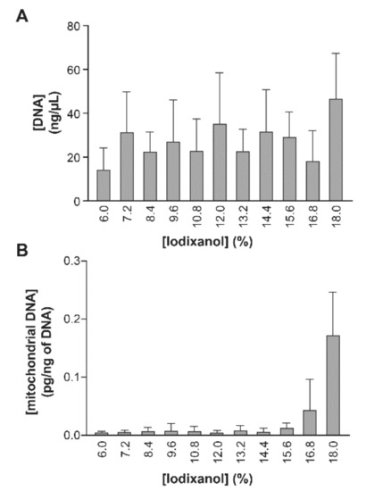 DNA extraction: Culture supernatants from Raji-CD4 cell-lines were microfiltered (0.22 µm), distributed in Beckman–Coulter tubes (Cat. 355618), and ultracentrifuged at 100,000× g for 45 min. The EVs pellets were resuspended in PBS and stored at −80°C until analysis. Samples were layered onto the velocity gradient and centrifuged as described above. To 200 µL of each fraction, 480 µL of lysis buffer (0.4% m/v Tris base, 1% m/v sodium dodecyl sulfate, and 100 mM EDTA), and 20 µL of proteinase K (25 mg/mL) were added, followed by holding at 55 °C for 10 min, adding 500 µL of phenol/chloroform/iosamyl alcohol, and centrifugated at 12,000× g for 3 min at 4 °C. The aqueous phase was mixed with an equivalent volume of chloroform, centrifuged again, mixed with absolute ice-cold ethanol, NaCl solution (to 0.5 M final), and 1 µL of GlycoBlue Coprecipitant, held at −80 °C for 30 min, and centrifuged at 12,000× g for 15 min. The DNA pellets were washed with cold 70% ethanol and quantified using a BioDrop spectrophotometer.