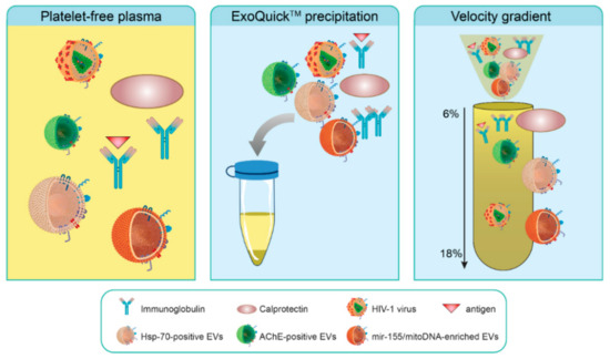 Iodixanol velocity gradient efficiently separates heterogeneous potential biomarkers from the plasma. The left panel represents non-exhaustive potential biomarkers present in the plasma. The middle panel illustrates that ExoQuick™ precipitates several biomarkers along with virions and calprotectin. The right panel illustrates that the velocity gradient might separate calprotectin, AChE-positive and Hsp-70-positive EVs, virions, and possibly new types of EVs enriched in miR-155 and mitochondrial DNA.