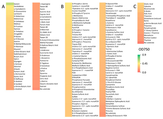 Heat map of substrates capable of supporting poor (0.15–0.3), moderate (0.3–0.6), and robust (>0.6) growth by R. lauricola. (A) Carbon substrates, (B) phosphorus and sulfur substrates, and (C) nutrient supplements (e.g., cofactors, vitamins, nucleotides, etc.).