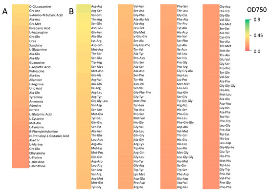 Heat map of nitrogen substrates which supported poor to robust growth. (A) simple nitrogen substrates and (B) peptide nitrogen substrates.