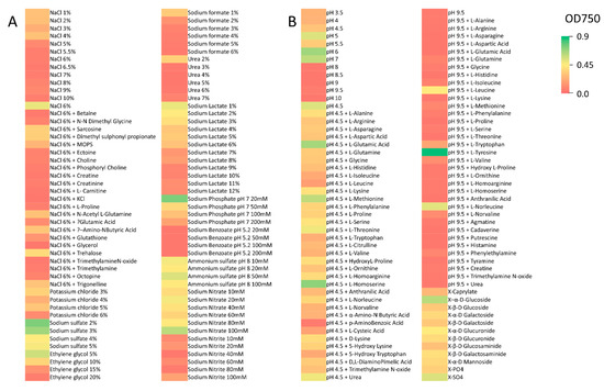 Heat map of all growth ranges (including no growth) for chemical compound/osmolytes tested, pH sensitivity assays, and X-linked substrates. (A) Chemical compound/osmolyte, and (B) pH conditions and X-linked substrates.
