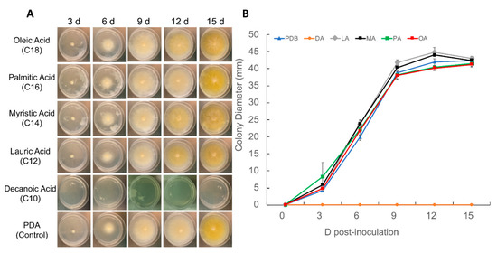 R. lauricola colony morphology and growth on control (PDA, potato dextrose agar, un-supplemented) plates, and plates supplemented with C10–C18 fatty acids as indicated. (A) Representative images of colony morphologies, and (B) growth curves based on colony diameter measurements. All experiments were performed using three technical replicates and the entire experiment repeated at least three times. Data presented ± SE (standard error).