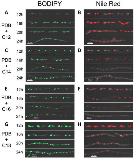 As BODIPY and Nile Red were demonstrated to give the most consistent results in terms of LD staining in R. lauricola, the analyses of LD formation was extended to growth on other fatty acids including lauric, myristic, and palmitic acids. Fungal cells were grown on the indicated fatty acids (0.05% and including unamended PDB and PDB + oleic acid) and aliquots of cells harvested over a time course (12–24 h) and stained with either BODIPY or Nile Red (Figure 7). As compared to LD physiology in un-supplemented media, a number of different LD phenotypes were observed: (1) strong induction of LD formation by oleic acid, as noted by larger and brighter punctate spots of fluorescence distributed across cells, (2) intermediate induction of LDs in myristic and palmitic acids, and (3) diffuse, less intense, (BIODIPY or Nile Red) signals, that were evenly distributed across the entire length of most conidia and hyphae in the presence of the shortest fatty acid chain length tested (that allowed for growth), namely lauric acid (C12). Furthermore, growth appeared stunted in the presence of lauric acid, with shorter swollen/bulging hyphae noticeable. Comparisons between Nile Red and BODIPY-stained samples within corresponding treatment groups revealed generally comparable LD distribution and size/shape; however, in the lauric acid-grown samples, diffuse fluorescence gave way to punctate spots of fluorescence at later time points using Nile Red, but not with BODIPY, suggesting that the two dyes may have slightly different lipid affinities and thus may provide useful complementary information on lipid droplet physiology when used in parallel.