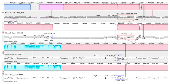 Whole-genome sequencing analysis was subsequently performed to obtain the genome sequence of YZU1797 and YZU1798. The raw reads were then uploaded to the European Nucleotide Archive database under accession number PRJEB40529. Core genome MLST (cgMLST) was executed to reveal that both strains were S. Virchow (6,7,14:r:1,2). The fljAB operon (fljA, fljB, and hin genes) is involved in the synthesis of phase-2 flagellar antigens [17]. Homology analysis was then carried out on the fljAB operon and its surrounding sequences in YZU1797 and YZU1798 with the published S. Virchow genomes (Figure 1). The results showed that both strains lost the fragment of the fljAB operon, which was subsequently replaced by a ~4.8 kb fragment obtained from E. coli. With nomenclature similar to the S. Typhimurium monophasic variant (Salmonella 4,[5],12:i:-) [17], the serovar of both strains was named the S. Virchow monophasic variant (Salmonella 6,7,14:r:-). During the period from 2004 to 2009, S. Virchow ranked among the five most frequent serovars in humans, and the incidence of infected children under 5 years old was seven-fold higher than in those older than 5 years [18]. S. Virchow has also been confirmed to be one of the most common invasive serotypes infecting children, and can be isolated from the stool, blood, and synovial fluid [2]. However, this study is the first report of the S. Virchow monophasic variant causing infections in children, and comparative genomic analysis was therefore applied to reveal the origin of this variant if more strains were obtained from clinical cases.