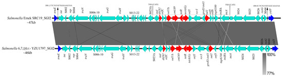 The minimum inhibitory concentration (MIC) of the 12 antimicrobial agents for YZU1797 and YZU1798 showed that both strains were multidrug-resistant (MDR) to chloramphenicol, tetracycline, trimethoprim, sulfamethoxazole, and nalidixic acid (Table 1). Genome sequencing analysis revealed that the presence of cmlA9, sul1, drfA1, tetA(G), and gyrA(S83F) in both isolates was involved in the antimicrobial resistance phenotype. Identification of antimicrobial resistance genes in the other 16 S. Virchow genes confirmed that BCW_2814 shared the same antimicrobial resistance genotype with YZU1797 and YZU1798 (Figure 2A). The antimicrobial resistance genes were located in the chromosome, since no plasmid was detected in either YZU1797 or YZU1798 by means of genome sequencing. Further analysis revealed that both S. Virchow monophasic variants acquired a ~43 kb Salmonella genomic island 2 (SGI2), including the antimicrobial resistance gene cassette (drfA1-cmlA9-tetR-tetA(G)-sul1) (Figure 3). The SGI2 was first reported in an S. Emek strain and was previously considered a variant from SGI1 (SGI1-J) [21]. The SGI2 or SGI1-J was also detected in three clinical S. Virchow isolates from human blood in 1993 and 1994 in China [22]. Within the SGI2, the integron carrying the antimicrobial resistance gene cassette was inserted in the S023 reading frame, flanked by a 5-bp target site duplication (TSD) (Figure 3), indicating that it was incorporated into the chromosome through transposition [23].
