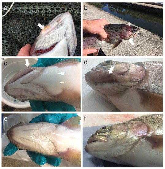 Gross clinical signs of cranial mandibular fibrosis syndrome. Rainbow trout sampled in 2018 showing: (a) discoloured nodular swelling on the jaw (arrow); (b) erythematous change to the “cheek” (asterisk) with marked swelling particularly to cranial tissue posterior to the eye and involving the operculum (arrow). Fish sampled in 2019 showing: (c,d) unilateral erythema and swelling in the region of the jaw; (e,f) unaffected fish sampled in the same farm, 2019.