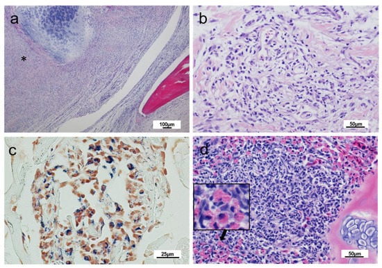 Consistently, affected fish showed a progressive jaw deformity, typically affecting only one side of the head. In severe cases, this deformity impaired gaping and mobility of the jaw. Histopathology revealed extensive inflammation surrounding the cartilage and infiltrated muscular and connective tissues. Multinucleated giant cells, formed by the fusion of macrophages [23], were sporadically observed in foci of inflammation. Their nuclear arrangement at one pole suggests they were of Langhans’ giant cell phenotype [24]. These cells secrete interleukins, promoting inflammatory processes associated with chronic inflammation and granulomatous conditions [24,25]. Inflammatory cells constituting the bulk of the cell infiltration included histiocytes and lymphocytes; mononuclear cell types that predominate in chronic inflammatory skin conditions [26].