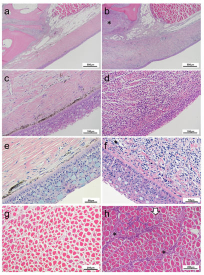Histopathology of rainbow trout affected with cranial mandibular fibrosis syndrome (CMF) from fish sampled in 2019. (a,c,e) Skin section of clinically healthy fish; Dermal layers are undisrupted; (b,d,f) Skin sections through mandibular region of affected fish; (b) Extensive inflammatory infiltration and cellularity disrupting the dermal layer for increased basophilia of the region, extending into subcutaneous tissues (*); (d,f) Detail of inflammatory cell infiltration and connective fiber necrosis for disruption of dermal structures; (g) Underlay musculature of healthy fish; (h) Inflammatory infiltration of the underlying musculature within the perimysium (*). Muscle fibers remain largely intact besides a foci inflammation (white arrow). (a–h) Haematoxylin and eosin stain.