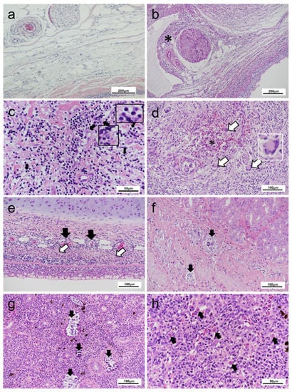 Pathological changes observed in rainbow trout displaying cranial mandibular fibrosis (CMF) syndrome. (a) Skin section of clinically healthy fish showing neural fibres; (b) Inflammatory infiltration (*) of the epineurium and neural tissue of CMF affected fish; (c) Necrosis with karyorrhexis debris alongside mixed inflammatory infiltration. Histiocytes, lymphocytes (black arrows and inserts) visible within disrupted dermal tissue; (d) High magnification section of less-typical presentation of CMF. Dermal tissue with focal haemorrhage (*) adjacent to multinucleated giant cells (arrows) in the region of the branchiostegal rays (‘folds’ region) of jaw section. Top right inset: detail of a multinucleated giant cell with nuclei arranged at one pole; (e) Perivascular infiltration by immunological cells. Dermatitis is accompanied by necrosis in the dermis (underlying cartilage is unaffected). Areas of necrosis (white arrows), inflammatory cell infiltration around the vascular structures (black arrows); (f) Calcinosis (arrows) of lamina propria and smooth muscle layers of the gastrointestinal tract; (g) Nephrocalcinosis (arrows) seen within the renal tissue; (h) PKD-infected head kidney with multifocal Tetracapsuloides bryosalmonae infection (arrows). (a–h) Haematoxylin and eosin stain.