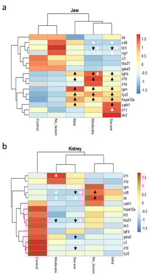 Heatmap dendrograms showing clustering of genes (mean values of normalized relative quantities) either in the jaw (a) or kidney (b) sections of rainbow trout displaying mild (4 fish), moderate (4 fish), or severe (8 fish) clinical signs of cranial mandibular fibrosis syndrome. No_lesion group (7 fish) refers to fish with no apparent lesions sampled in the affected site. The same fish stock was sampled from a nearby unaffected farm and used as negative controls (7 fish). Arrows show the direction (up or down-regulated) of the genes that were differentially expressed (p < 0.05) either from the control group (black arrows) or the no-lesion group (white arrows).