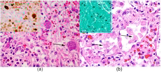 Opportunistic infections recorded in Panthera: (a, H&E) Tiger #5, lung, type II pneumocytes and macrophages are markedly enlarged (up to 70 μm in diameter) and filled with an intracytoplasmic parasitopohorus vacuole that contains numerous 2–4 μm, round to fusiform, basophilic tachyzoites. Inset is the IHC for Toxoplasma gondii, which confirms strong immunoreactivity within infected cells. (b, H&E) Tiger #6, lung, alveolar macrophages and few type II pneumocytes are enlarged and contain numerous intracytoplasmic round to ovoid, pale basophilic, 2–5 μm in diameter yeasts with 1–2 μm thick walls (arrows) that are also GMS-positive (black, inset). Microbiology culture was most compatible with Histoplasma capsulatum.