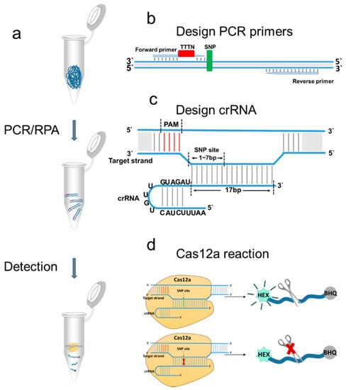 Experimental CRISPR-Cas12a detection-based design. (a) We first amplified the target fragment to improve the detection sensitivity. We then added the amplified substrate to the CRISPR-Cas12a reaction, and the signal from the probe was detected. (b) We used PCR primers to introduce the PAM sequence into the amplified product. (c) crRNA comprises a universal sequence and complementary sequence. (d) When crRNA and substrate DNA are completely matched, strong fluorescence is emitted. When crRNA and the substrate DNA are not completely matched, no fluorescence or weak fluorescence is emitted.