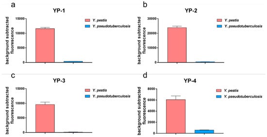 We chose four Y. pestis-specific tags to detect Y. pestis, naming them YP-1, YP-2, YP-3, and YP-4 sites. We found that the fluorescence intensity produced by the detection of Y. pestis was much higher than that of Y. pseudotuberculosis, a statistically significant difference (Figure 3). The detection results for the four sites were the same, and the fluorescence intensity clearly distinguished Y. pestis from Y. pseudotuberculosis.