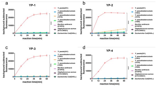 Specificity of the method used to differentiate Y. pestis from other bacteria. YP-1, YP-2, YP-3, and YP-4 tags were used to verify the method’s specificity. Seven strains including Y. pestis (Y. pestis 201), Y. pseudotuberculosis (Yp1682, Yp1678, and Yp1688), B. anthracis (A16PI2), S. aureus (ATCC49521), and E. coli (DH5α) were used to detect the four tags. Fluorescence intensity was detected at 0, 12, 24, 36, 48, and 60 min into the Cas12a reaction. The fluorescence intensity at each time point was used to plot and analyze the results. The results of detecting YP-1 tag (a), YP-2 tag (b), YP-3 tag (c) and YP-4 tag (d) showed that the tags differentiated Y. pestis from non-Y. pestis (two-way repeated measures ANOVA, p < 0.0001).