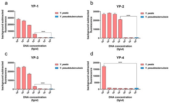 Sensitivity of the method used to differentiate Y. pestis from other bacteria. Bar charts show the fluorescence intensity detected at 60 min. Y. pseudotuberculosis was used as the control strain. The fluorescence values for YP-1 tag (a), YP-2 tag (b), and YP-3 tag (c) showed statistically significant differences compared with the negative control when the concentration reached 103 fg/μL (t-test, p < 0.001). (d) The fluorescence values for the YP-4 tag showed statistically significant differences compared with the negative control when the concentrations of the sites reached 106 fg/μL (t-test, p < 0.001).