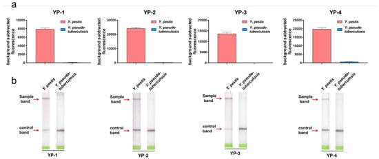 To shorten the detection time, we used RPA instead of the traditional PCR method to amplify the target DNA. The results in Figure 6a show that strong fluorescence was detected with Y. pestis, whereas only weak fluorescence was detected with Y. pseudotuberculosis. We next used RPA combined with LFD as the visualization method to identify Y. pestis. Figure 6b shows that the Y. pestis strain produced a visibly strong dark colored band on the test position of the strips, indicating that the test results were positive. In contrast, no bands in the test results area were visible for Y. pseudotuberculosis. These results indicate that the visualization method can distinguish Y. pestis from Y. pseudotuberculosis.