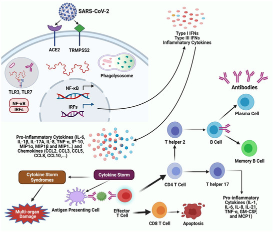 Immune responses to SARS-CoV-2. SARS-CoV-2 infects human cells in the angiotensin-converting enzyme 2 (ACE2 receptor) and the cellular serine protease TMPRSS2 for viral S protein priming. Endosomal and cytoplasmic sensors, toll-like receptor (TLR)-3 or -7 and mitochondrial antiviral-signaling protein (MAVS) are activated by viral RNA. Inflammatory cytokines and interferons (IFN) are contentiously induced by interferon regulatory factors (IRFs) and NF-κB, respectively. Most patients with severe COVID-19 exhibit considerably elevated serum levels of pro-inflammatory cytokines, including IL-6 and IL-1β, as well as IL-2, IL-8, IL-17, G-CSF, GM-CSF, IP10, MCP1, MIP1α (also known as CCL3), and TNF, characterized as a cytokine storm. The activation involved in the overproduction of cytokines (a phenomenon known as cytokine storm syndromes that cause respiratory distress) causes multi-organ damage. If an effector T-cell activates, it triggers the differentiation into CD4 and CD8 T cell. CD8 T-cell is capable of binding; it will undergo clonal expansion and immediately target infected cells by apoptosis through various pathways. If the CD4 T-cell is capable of binding, it can activate B-cells that recognize the antigen by causing them to clonally proliferate and secrete antibodies to target the SARS-CoV-2 virus. Abbreviation: ACE2, angiotensin-converting enzyme 2; COVID-19, coronavirus disease COVID- 19; TLRs, toll-like receptors; NF-κB, nuclear factor kappa-light-chain-enhancer of activated B cells; IRFs, interferon regulatory factors; IFN, interferons; IL, interleukin; TNF- α, tumor necrosis factor-alpha; MIP, macrophage inflammatory proteins; MCP-1, monocyte chemoattractant protein-1; IP, interferon gamma inducible protein; GM-CSF, granulocyte-macrophage colony-stimulating factor.