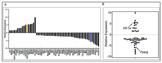AMs are vital for regulating anti-Pneumocystis immunity and lung injury. Despite this, AM responses at the TF level leading to specific proinflammatory responses are poorly understood. Therefore, we sought to explore the TF response of AMs in the presence of Pneumocystis. Briefly, we infected wild-type (WT) mouse AMs with Pneumocystis murina (Pm) to determine the expression levels of 84 TFs following 18 h culture utilizing the Qiagen RT2-PCR TF array. These initial experiments were repeated three times on separately isolated AMs and Pm populations and total RNAs were pooled. Before the arrays were conducted, we confirmed that all three experiments displayed similar TNF-alpha responses. Indeed, the application of Pm organisms to the AMs gave significant, robust, and repeatable TNF-alpha secretion profiles as measured by ELISA (Supplementary Figure S1). Furthermore, upon analysis, we found a number of TFs either down- or upregulated that have been previously implicated in Pneumocystis AM interactions, including previously upregulated TFs Irf1, and Nfkb1, and in the murine Pneumocystis pneumonia (PCP) model, we observed the downregulation of Egr1 [9]. Although little is known about the host TF responses of AMs to Pneumocystis, these confirmatory results give further support to our PCR array findings. From our PCR array experiments, we determined that of the 84 TFs analyzed, 17 were upregulated between 1.5- and 10-fold, and 40 were downregulated between 1.5- and 10-fold. These total 57 TFs are listed in Figure 1A. We decided to further analyze two specific TFs from the PCR array based on their previously reported importance in AM microbial pathogen interactions, Hif-1a and Pparg, both noted with orange or blue color, respectively, in the bar graph (Figure 1A) and scatterplot (Figure 1B). From the PCR array, the fold change compared to the mock control was 5.4 for Hif-1a and −5.8 for Pparg (Table 1).