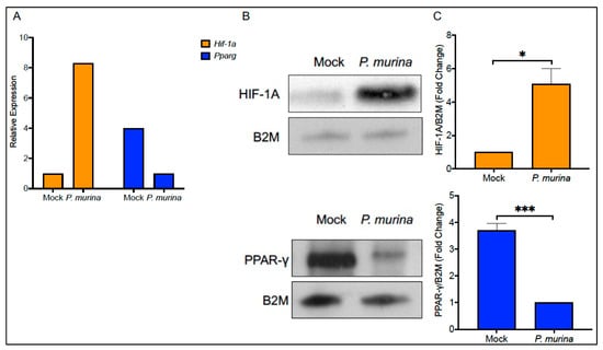 Next, quantitative PCR (qPCR) was implemented to confirm the PCR array results. Indeed, upon qPCR analysis, we further confirmed that Hif-1a was upregulated and Pparg downregulated in AMs upon Pm stimulation overnight (Figure 2A). In addition to changes in the transcription of both Hif-1a and Pparg in the presence of Pm, we also measured AM protein levels of both these TFs by Western blotting. Again, similar to the PCR array and qPCR data, a significant increase in HIF-1A protein levels was noted, whereas a significant decrease was noted in PPAR-γ levels when compared and quantified compared to the housekeeping B2M protein loading control (Figure 2B,C).