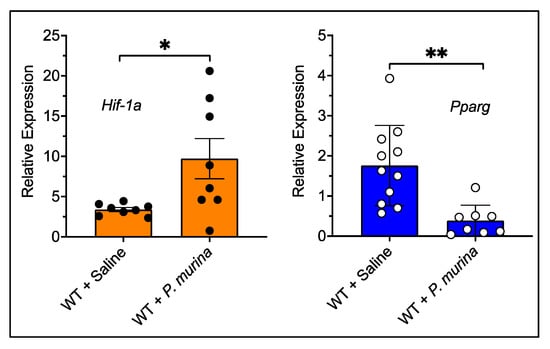 The mRNA expression level of Hif-1a and Pparg during Pneumocystis pneumonia (PCP). The mRNA expression levels were determined in the infected animal lungs after 10 weeks of infection. The mRNA levels were quantified by qPCR as compared to B2M mRNA levels. A total of 8–11 mice per group were analyzed. For each PCR condition, the sample was measured and averaged from duplicate wells. * p < 0.05, ** p < 0.01.