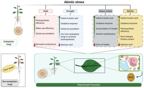 - Eid, A.M.; Salim, S.S.; Hassan, S.E.-D.; Ismail, M.A.; Fouda, A. Role of Endophytes in Plant Health and Abiotic Stress Management. In Microbiome in Plant Health and Disease; Kumar, V., Prasad, R., Kumar, M., Choudhary, D.K., Eds.; Springer: Singapore, 2019; pp. 119–144. ISBN 9789811384943. [Google Scholar]