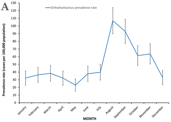 A significantly higher hospitalized orthohantavirus prevalence rate was observed during 2010, 30.2 (95% CI, 23.8 to 36.7) cases per 100,000 population than all other years in the study, except for 2016, with 20.2 (95% CI, 14.9 to 25.4) cases per 100,000 population (Figure 2B). The 95% CIs were calculated for each orthohantavirus prevalence rate using Microsoft Excel to determine the significant difference between orthohantavirus prevalence rates [30].