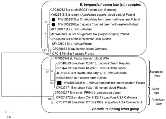 Three randomly selected PCR products identified by RFLP as B. afzelii and B. miyamotoi were sequenced. Sequences of B. afzelii (GenBank: MW595226–595227) were identical and showed 100% nucleotide identity with those of the BO23 and K78 strains, which are pathogenic to humans (GenBank: CP018262, CP009058) (Figure 1). These sequences were also 100% identical to B. afzelii sequences derived from Ixodes ticks questing (GenBank: MF150047) and feeding on fox (Vulpes vulpes) (GenBank: MG944962) and from the blood of rodent Apodemus agrarius (GenBank: KY626318) in Poland. The PCR product from I. ricinus removed from red deer skin identified as B. miyamotoi (GenBank: MW59528) was grouped with the sequence of isolate Mos-80 of B. miyamotoi from Russian I. ricinus designated as European-type [24,25]. On the phylogram, the obtained B. miyamotoi sequence clustered with other sequences derived from questing I. ricinus from the Czech Republic (GenBank: CP046389), from the Netherlands (GenBank: CP044783), and from Poland (GenBank: KX646199) (Figure 1).