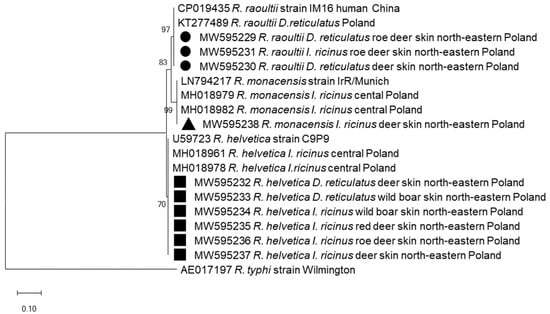 To identify the Rickettsia species, ten amplicons of the gltA gene fragment (769 bp) were sequenced. Sequenced amplicons were derived from diverse tick species collected from different hosts. Comparison with the data registered in the GenBank revealed the presence of R. helvetica (n = 6), R. raoultii (n = 3) and R. monacensis (n = 1). Four R. helvetica sequences (GenBank: MW595234–595237) derived from I. ricinus were collected from red deer, roe deer and wild boar and two (GenBank: MW595232–595233) were derived from D. reticulatus feeding on deer and wild boar. All obtained R. helvetica sequences were identical and clustered with the R. helvetica strain C9P9 (GenBank: U59723) and sequences derived from questing I. ricinus from Poland (GenBank: MH018961–78) (Figure 2). Three sequences (MW595229–595231) derived from I. riciuns and D. reticulatus feeding on deer were identical with the R. raoultii strain IM16 isolated in a human sample from China (GenBank: CP019435) and from questing D. reticulatus in Poland (GenBank: KT277489) (Figure 2). The remaining single Rickettsia sequence (MW595238) obtained from I. ricinus collected from deer displayed 100% identity with gltA sequences of the R. monacensis strain IrR/Munich from Germany (GenBank: LN794217) and from questing I. ricinus ticks from Poland (MH018979–82).