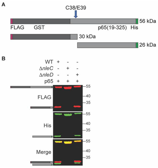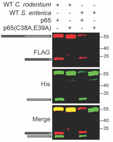 Salmonella enterica also induces p65 cleavage in host cells [21,22]. We tested whether p65 is cleaved inside S. enterica in a similar fashion to C. rodentium. We expressed the recombinant WT and C38A/E39A p65 constructs in S. enterica and observed cleavage of only the WT p65 construct, similarly to what was observed for C. rodentium (Figure 4 and Table S1). S. enterica harbors at least three distinct T3SS effectors, GogA, PipA, and GtgA, that cleave p65 inside host cells [22]. At least one of these effectors may be active within S. enterica.
