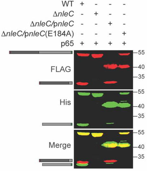 NleC enzymatic activity is significantly reduced in the host cell when the critical NleC residue E184 around the Zn2+ binding pocket is mutated to A184 [7]. To further evaluate p65 cleavage specificity and its dependence upon NleC activity, we co-transformed ΔnleC C. rodentium with a p65 expression plasmid and either WT NleC or NleC E184A complementation plasmids. The recombinant p65 was cleaved by WT NleC but not by NleC E184A (Figure 2).