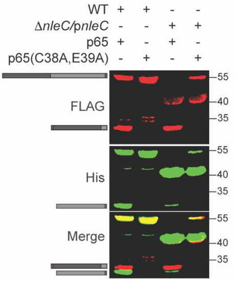 NleC does not cleave the p65 (C38A/E39A) mutant. WT and mutant p65 were expressed in WT C. rodentium. Experiments were conducted as described in Figure 1 panel B.