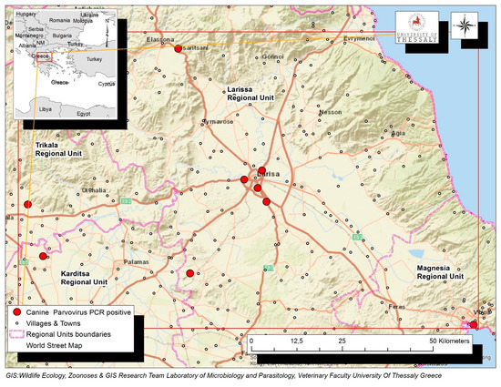 Spatial analysis has been implemented to compare either CPV-2 prevalence in dogs between rural and urban regions by using serological methods [16,25] or exposure οf dogs to the pathogen in regions where dog-wildlife interaction occurred [19]. A recent study from Australia reported large numbers of CPV cases in dogs of rural and remote areas [23,26] by using spatial analysis combined with molecular diagnosis. Currently in Greece, there is a lack of information on environmental parameters associated with the virus presence.