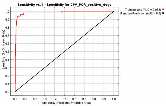 Receiver operating characteristic (ROC) curve of Maxent model for CPV-2 DNA positive dogs. The area under the curve (AUC) had value of 0.983 and exceeded that of random prediction (AUC = 0.5).