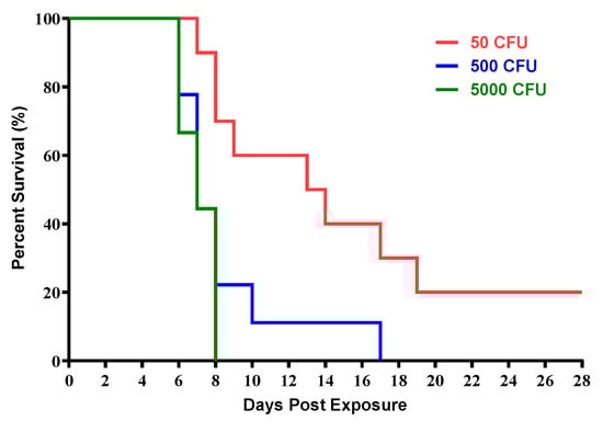 Survival of cynomolgus macaques exposed to increasing doses of aerosolized F. tularensis. Group sizes were n = 10 (50 CFU target dose), n = 9 (500 CFU target dose), and n = 9 (5000 CFU target dose).