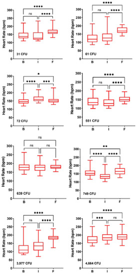 Mild elevation in heart rate during the febrile period. Data is shown from eight individual macaques across all dose ranges; values plotted are the median with the standard deviation and range for each period. Challenge doses are shown for each macaque. Significant changes from baseline were determined by Brown–Forsythe’s analysis of variance (ANOVA). n.s. = not significant, * = p < 0.05, ** p < 0.01, *** p < 0.001, **** p < 0.0001.